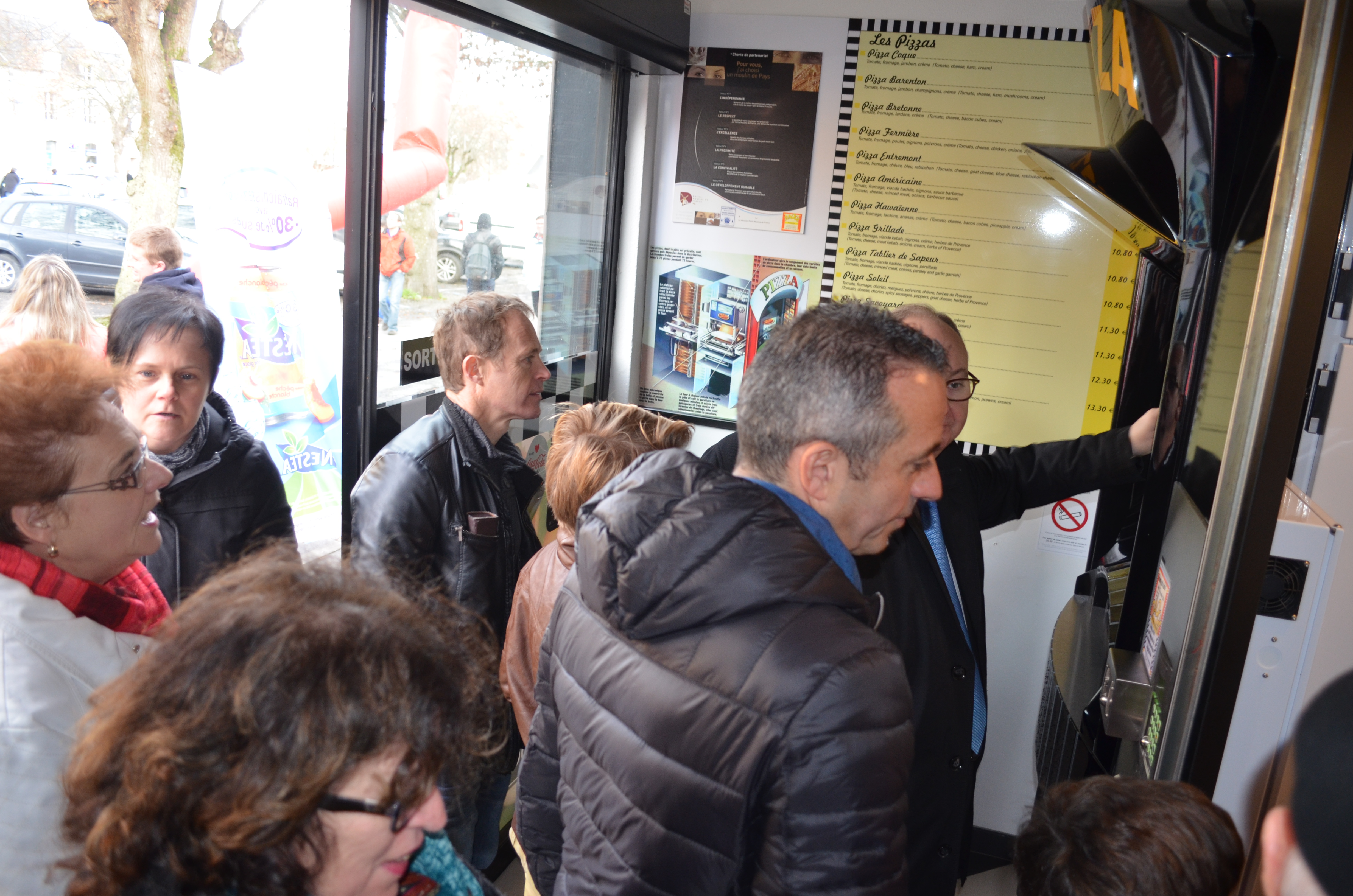 Un chapiteau gonflable, plein de monde et… des pizzas! C’était ce samedi matin, l’inauguration officielle du distributeur automatique de pizzas mis en place par Raoul restauration à Malestroit. Visiblement, cette innovation vous passionne. Vous avez été très nombreux à venir consulter sur notre site l’article que nous avons consacré à l’annonce de cette inauguration. Et visiblement, vous avez été très nombreux à vouloir voir de près ce nouveau concept. Il y avait foule, ce samedi, chez Raoul pour écouter les explications du restaurateur. La question que tout le monde se pose, c’est de savoir comment on peut déguster des pizzas fraiches, à n’importe quelle heure du jour ou de la nuit, simplement en pressant quelques boutons sur un appareil. Le procédé est ingénieux. En fait, le restaurateur fabrique ses pizzas normalement, comme si elles devaient être servies au comptoir. De la même façon elles sont cuites à 75%, les derniers 25% de cuisson étant apportés juste avant la livraison. Là, c’est le distributeur qui s’en charge. Il sélectionne la pizza choisie par le client et la glisse dans un four qui achève la cuisson. Et voila, en quelques minutes, le client repart avec sa pizza fraiche. Le problème pour le restaurateur c’est d’alimenter son distributeur. « On a sélectionné les pizzas qui ont le plus de succès. On peut en mettre plus de 60 dans le distributeur et tout est géré à distance… », explique Raoul. Depuis son portable, il peut en effet consulter l’état du stock et le fonctionnement du distributeur. Il est ainsi prévenu lorsqu’une catégorie vient à manquer. Par contre, dans ce cas, il n’y a plus qu’une solution : retourner en cuisine pour fabriquer de nouvelles pizzas.